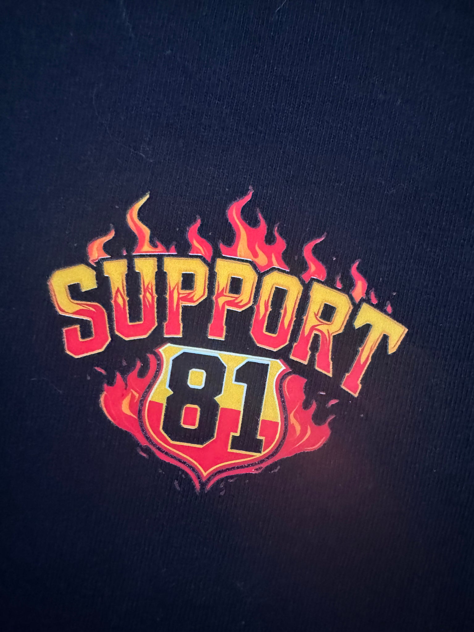 The Support 81 Devil Flames Long Sleeve T-Shirt! Each order includes a limited-edition Support 81 Halloween sticker pack with seven unique stickers, available only with this shirt. Perfect for fans seeking distinctive apparel and collectible extras, this lo exclusive perks. Featuring a striking devil flame design, this long sleeve offers both comfort and standout looks. ng sleeve merges quality wear with exclusive graphic flair.