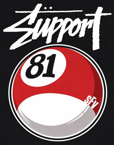 Bold. Clean. Repping the valley. The Support 81 SFV Billiard Ball Tee brings together iconic design and California pride in one statement piece. The oversized 81 ball graphic hits hard on a premium black tee — made to be seen at the show, on the ride, or anywhere you rep the culture.